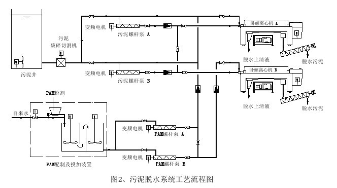 NOXON 臥螺離心脫水機的整體集成性能優(yōu)良,絮凝劑投加裝置、絮凝劑泵、污泥泵等均隨離心機配套供應(yīng),在自控系統(tǒng)的支持下,組成了一個有機整體,其工藝流程如圖 2 所示。