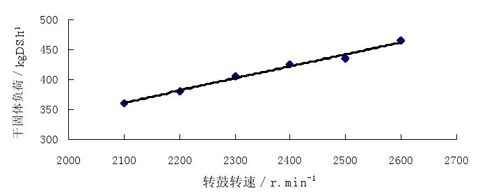 所謂干固體負荷是指每小時處理的不揮發(fā)固體重量,以 KgDS(干污泥)/h 表示。調(diào)整離心機的干固體負荷,對污泥脫水效果有很大影響,當進泥流量(即“水力負荷”)達到一定程度,所帶入的懸浮物含量超過了離心機所能承受的最大干固體負荷時,會造成泥餅含水率增加,上清液帶泥增多,此時應(yīng)該減少進泥流量,使離心機脫出的上清液清澈在實際運行中,必須通過調(diào)整水力負荷,來保證進入離心機干固體負荷不超過離心機的最大承受能力,否則,多余的干固體將從上清液中排出,上清液的懸浮物會急劇增多,但脫水泥餅的產(chǎn)量并沒有增加。該廠使用的離心機,當轉(zhuǎn)鼓轉(zhuǎn)速為 2300rpm、進泥濃度為 35 g/L 時,離心機運行的干固體負荷可達 405kg/h。當離心機磚鼓轉(zhuǎn)速增加時,干固體負荷也會相應(yīng)增加,圖 3 是最大干固體負荷隨離心機轉(zhuǎn)鼓轉(zhuǎn)速變化的曲線。