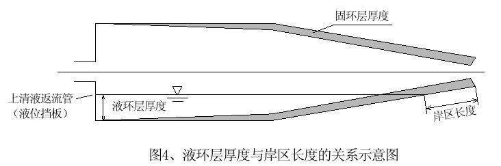 當進泥量一定時,如果液環(huán)層厚度較大,污泥在離心機內(nèi)的停留時間長,污泥在液環(huán)層內(nèi)進行分離的時間越長,會有更多的污泥被分離出來,并能夠降低某些小顆粒受擾動而隨分離液流失的可能性,但液環(huán)層厚度過大,會造成水隨脫水后的污泥從污泥出口溢出;如果離心機內(nèi)的液環(huán)層厚度較小,污泥在離心機內(nèi)的停留時間短,工作壓力不容易提高,但脫水后的污泥含水率也較低。綜合以上兩方面的作用,液環(huán)層增厚一般會提高脫水的固體回收率,但液環(huán)層增厚,相應(yīng)會使岸區(qū)縮短,如上圖所示,使脫離液環(huán)層的污泥沒有充足的時間被甩干,因此泥餅含固率將下降。在控制液環(huán)層厚度時間應(yīng)