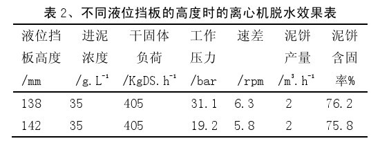 (6) 通過改變液位擋板的位置來調(diào)整離心機的液環(huán)層厚度,對離心機污泥脫水效果的影響非常大,必須通過反復(fù)的試驗,將液環(huán)層厚度設(shè)定在合適的水平,則可以保證污泥的含水率會降低,并且有較高的污泥產(chǎn)量;