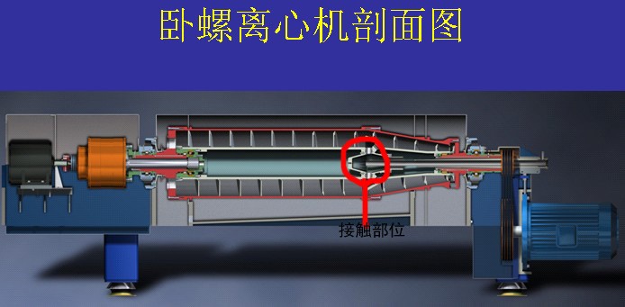 綜述:以上第4點(diǎn)是解決離心機(jī)運(yùn)行時(shí)的靜態(tài)耐磨措施,由于泥漿等硬質(zhì)廢水剛進(jìn)離心機(jī)有一定的沖擊磨損及動(dòng)態(tài)磨損,從離心機(jī)剖面圖上可以看到,廢水是經(jīng)進(jìn)料管直接通到離心機(jī)紅圈部位(如圖1),此部位我們?cè)O(shè)計(jì)了凹槽結(jié)構(gòu),就是為了減少泥漿對(duì)初接面的沖擊力,經(jīng)此回流的低速?gòu)U水就可以安全處理了。在初接面的區(qū)域設(shè)計(jì)實(shí)心(如圖2),即便有沖擊磨損,實(shí)心區(qū)的材質(zhì)也足夠5年以上的磨損,離心機(jī)也得到最大限度的保護(hù)。