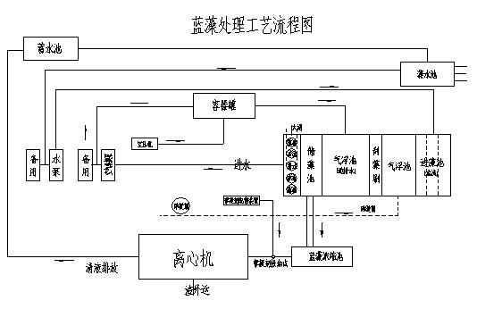 藍藻由水泵從湖面抽至進藻池內(nèi),藻泥由進藻池溢流到氣浮池,在氣浮池內(nèi)由空壓機泵入氣、水對氣浮池內(nèi)的藻泥進行攪動的同時,另一條管線泵入助凝劑進行助凝,經(jīng)過助凝和氣浮后的藻泥,由于比重較輕因此浮在池面上,這時通過刮藻刷把氣浮池表面堆積的藻泥刮到儲藻池,儲藻池內(nèi)上層藻泥溢流至藍藻濃縮池,下部水通過管路排出進入容器罐,在藍藻濃縮池經(jīng)過濃縮后的藻泥通過與絮凝劑投加裝置輸送過來的絮凝劑進行絮凝后進入離心機進行分離后,分離后的渣相外運,液相排入湖面。
