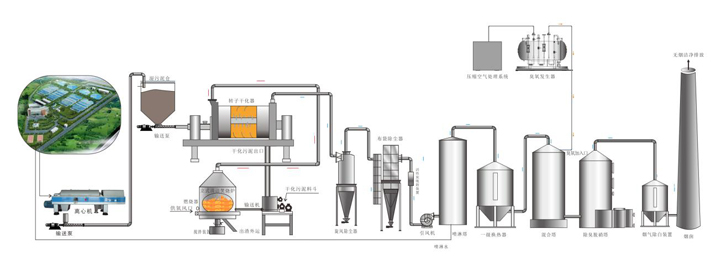 2、脫水污泥被輸送至干化器,通過直接與熱煙氣接觸,在干化器內實現(xiàn)加熱和干化;經干化后的物料與一定比例的輔助燃料充分混合后進入立式清潔焚燒爐焚燒,干化后的尾氣經尾氣處理系統(tǒng)清潔凈化后,無煙潔凈排放;