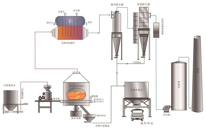 2.儲(chǔ)存?zhèn)}里的污泥通過輸送機(jī)均勻定量的將污泥送入立式清潔焚燒爐進(jìn)行焚燒處理,焚燒后形成的炭化物在燃燒過程中逐漸向立式清潔焚燒爐中心移動(dòng),徹底完成焚燒的灰渣經(jīng)由多孔管吹出的空氣得到冷卻,最終從處于中心部位的灰渣排出口排出;